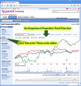 Stock Price... that is the question, isn't it? Trying to determine where a stock price is going to go in the future, relative to where it is now. Understanding historical prices for your stock is extremely important, but knowing what the past causes ("market forces") were for those price changes is invaluable. The link above and the other links to the facts is only half the homework necessary to analyzing stock prices. If you see a major spike, as shown for AMD above (i.e., at the end of December, 2009), you can go to AMD's Investor Relations page on their website and try to determine what the news was that probably caused that spike in its share price. Likewise, you can then extrapolate the effect it had on Intel's stock price/performance, as a result.