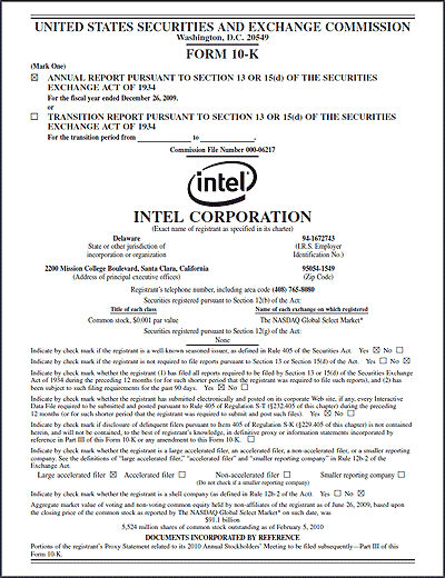 Company's Annual Report: We applaud Intel for its 2009 Annual Report, given that it's only four pages, including the cover. Wow... succinct is so refreshing. Here's what we found: