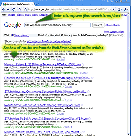 Source search (where the WSJ paper my be cited as the source, but on other sites): Example: source:wall_street_journal "Intel announces"+secondary [link: here >] Results: For Intel, this confirms that a secondary offering has not been done in a while, but provides links to several other announcements that include "Intel announces" on the pages. (these are GREAT tips to research any site, for any company - also for related company news!)