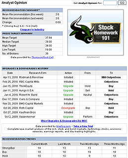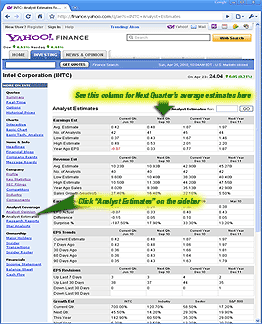 What the Analyst's Estimates are: From the link above, this page indicates that the current quarter (i.e., Q2) ends in June 2010. It also provides relative comparisons to estimates for the remaining quarters of the year, and for the year in total. Note that there are 42 analysts who follow INTC, for which they have officially recorded their guidance. This is an average of all 42 of those projections for Intel's stock.