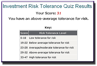 Each of these quizzes will give you a general rating and feedback regarding your personal risk tolerance, based on the answers you provided. These are tools to help your overall perspective. They should not be used for your investment decisions, but for general guidance alone. Consult your own financial advisor for expert advice, prior to investing.